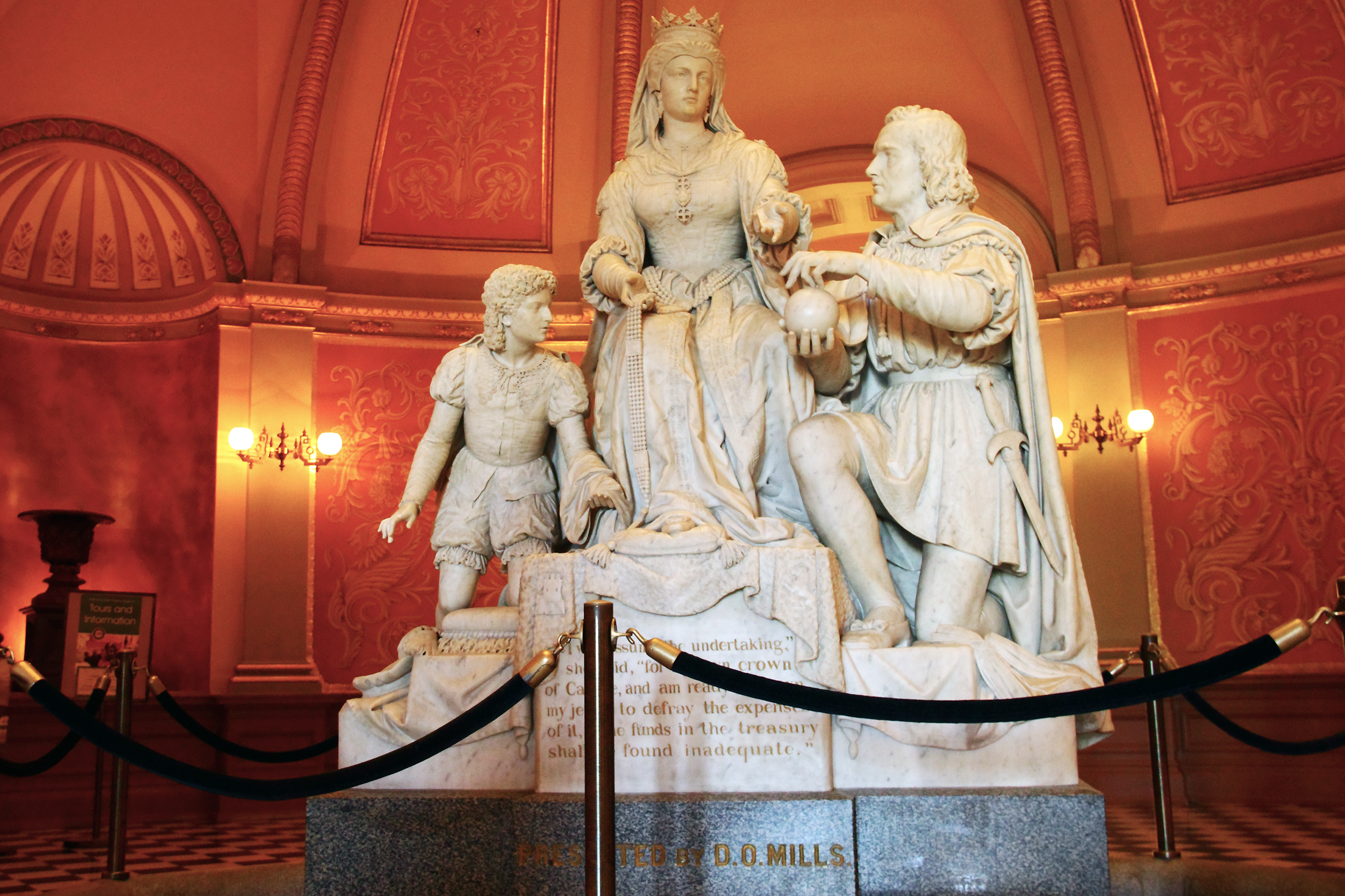 The statue depicts Columbus appealing to Queen Isabella I, who financed his voyage to the New World.