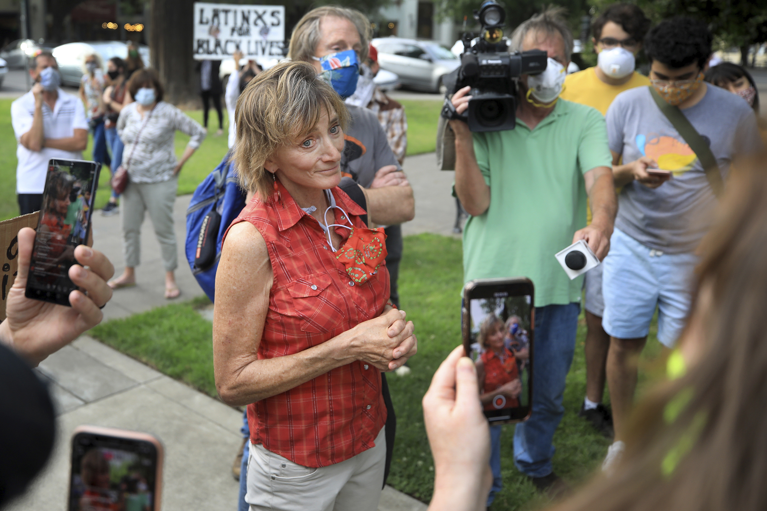 Mayor Leah Gold got into a pointed exchange with protesters in Healdsburg on June 15.