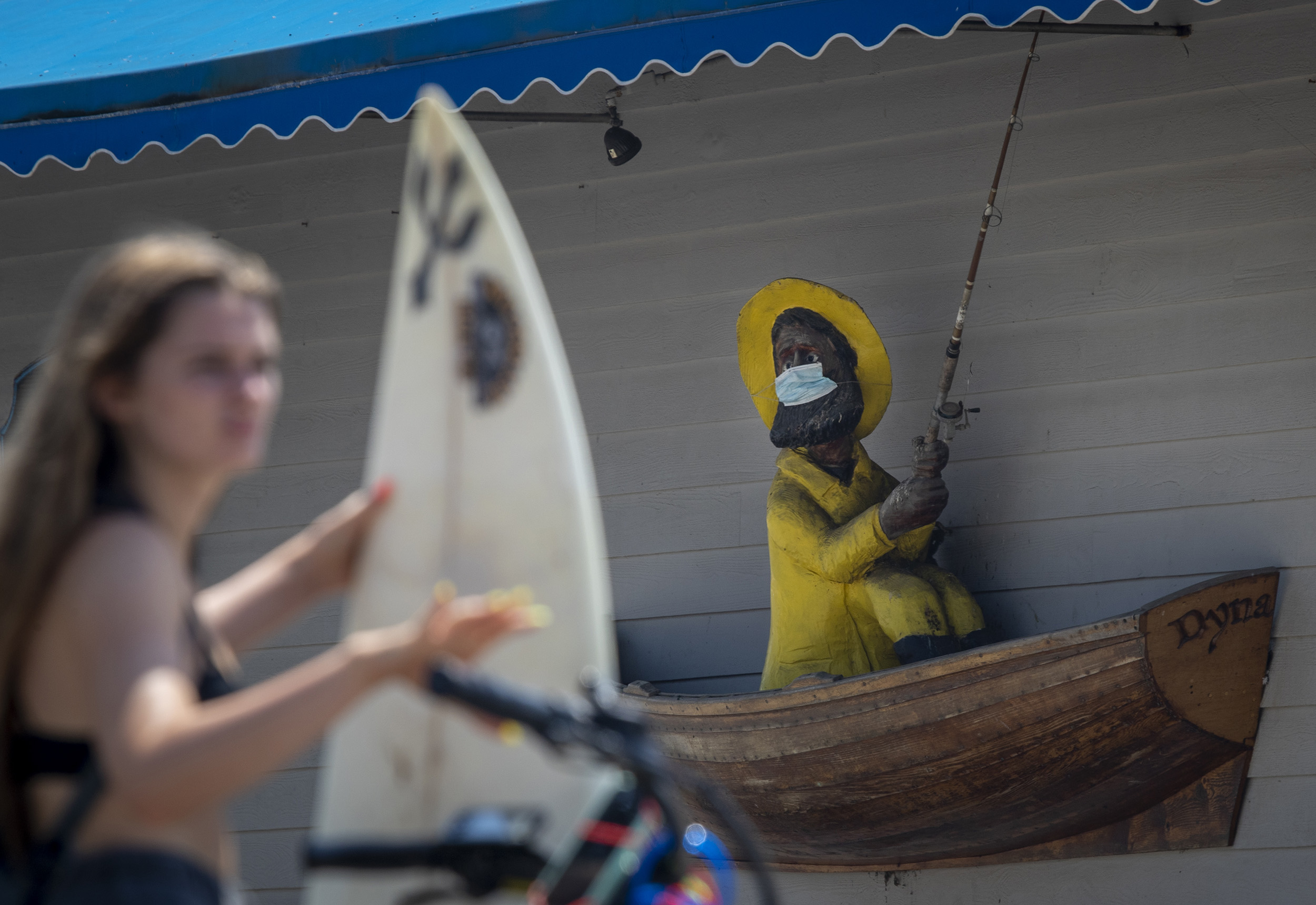 A fisherman statue was fitted with a mask at the San Clemente pier.
