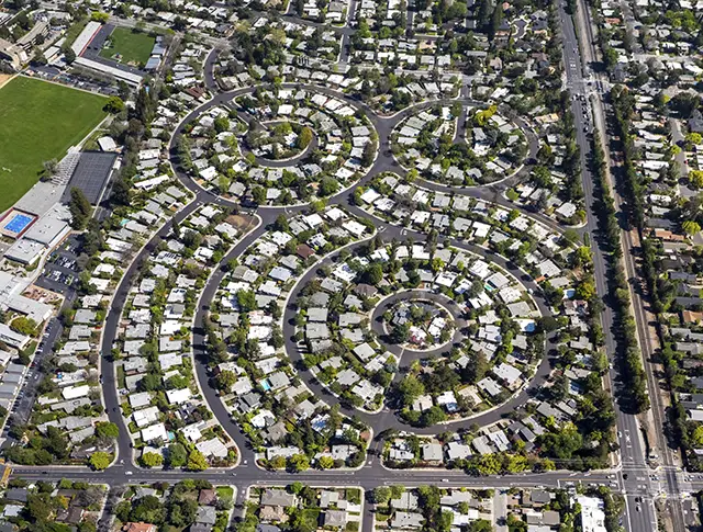 Joseph Eichler, the renowned Bay Area developer who brought stylish architecture to the masses, was known to be a sometimes gruff fellow. But his homes included playful touches: a colorful door, roof beams that cast artful shadows, and street designs that rejected the monotony common of suburbia. This was most vividly demonstrated in Eichler’s Fairmeadow development in Palo Alto, pictured above. While maddeningly confusing to visitors, the neighborhood’s concentric circles eliminated through traffic, allowing life to spill onto the street, where kids bike and play. Eichler Network