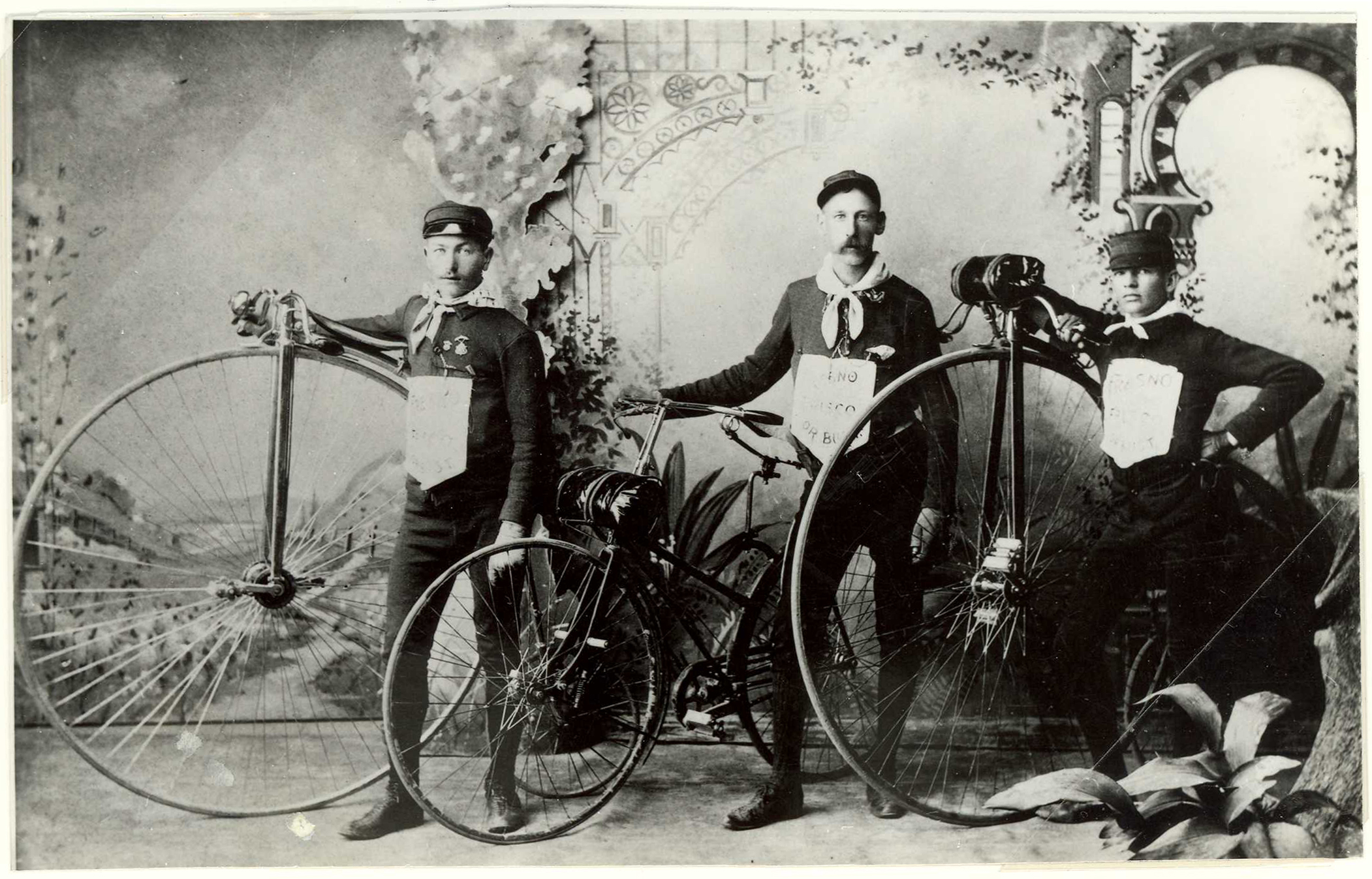 Bicycle mail carriers in 1894. These riders were part of an emergency mail service established to carry letters between Fresno and San Francisco during a railroad strike that year.