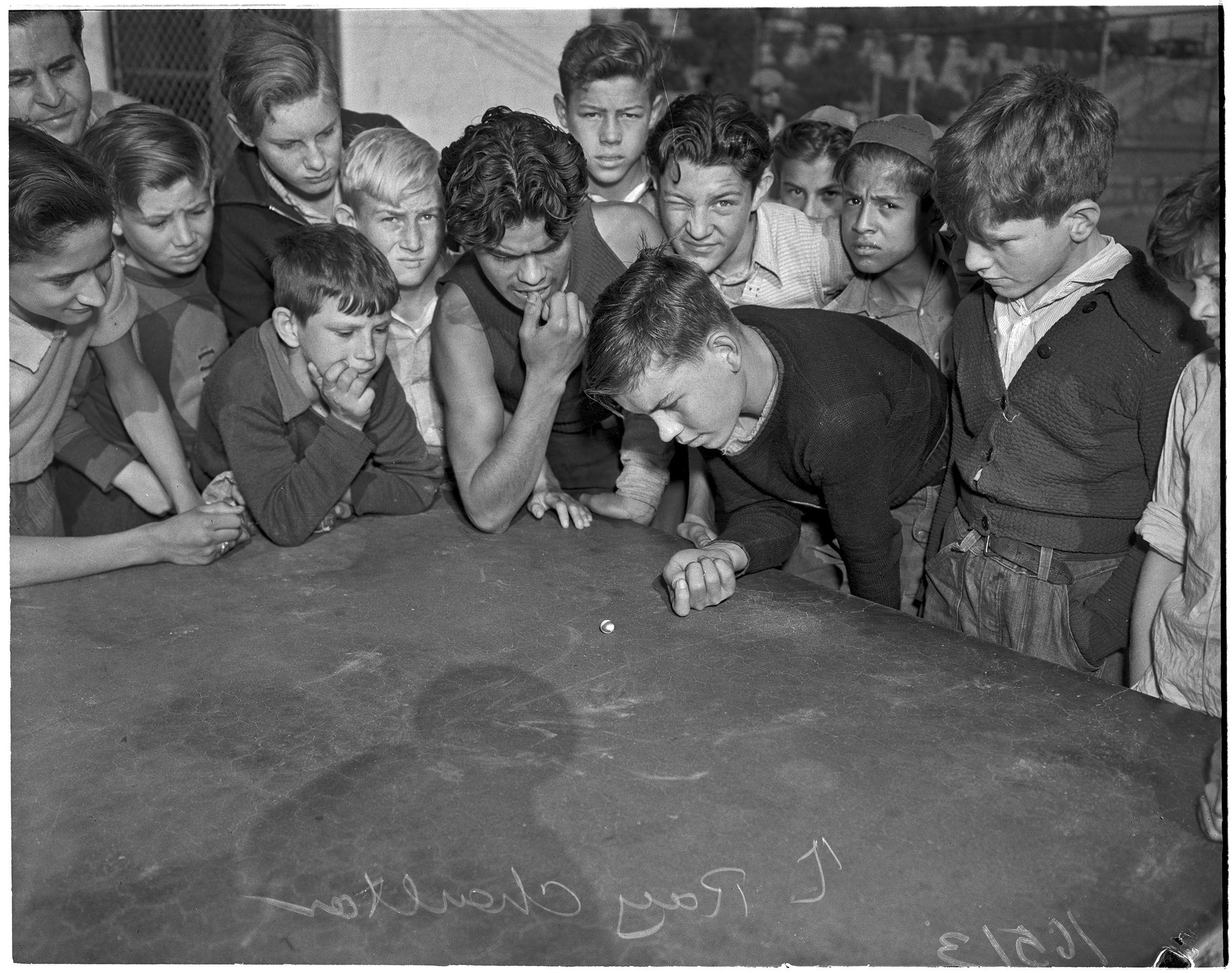 This image shows Ray Charlton, 14, “marble champion of Los Angeles,” in 1937. Ray beat 50 competitors in an event organized by the Los Angeles Playground Department.