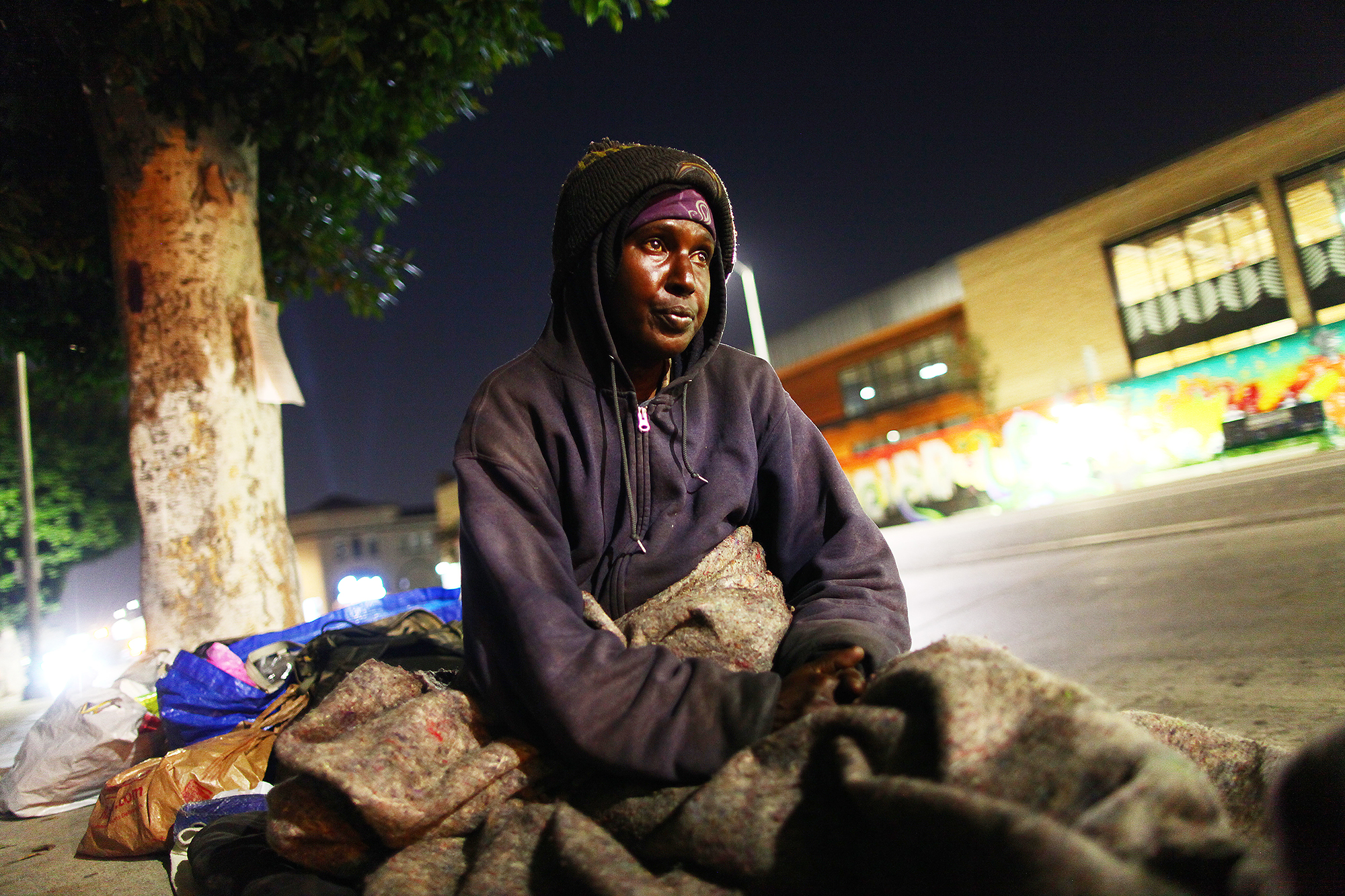 Reverend D prepared to sleep for the night on a sidewalk in Los Angeles on Sept. 9.