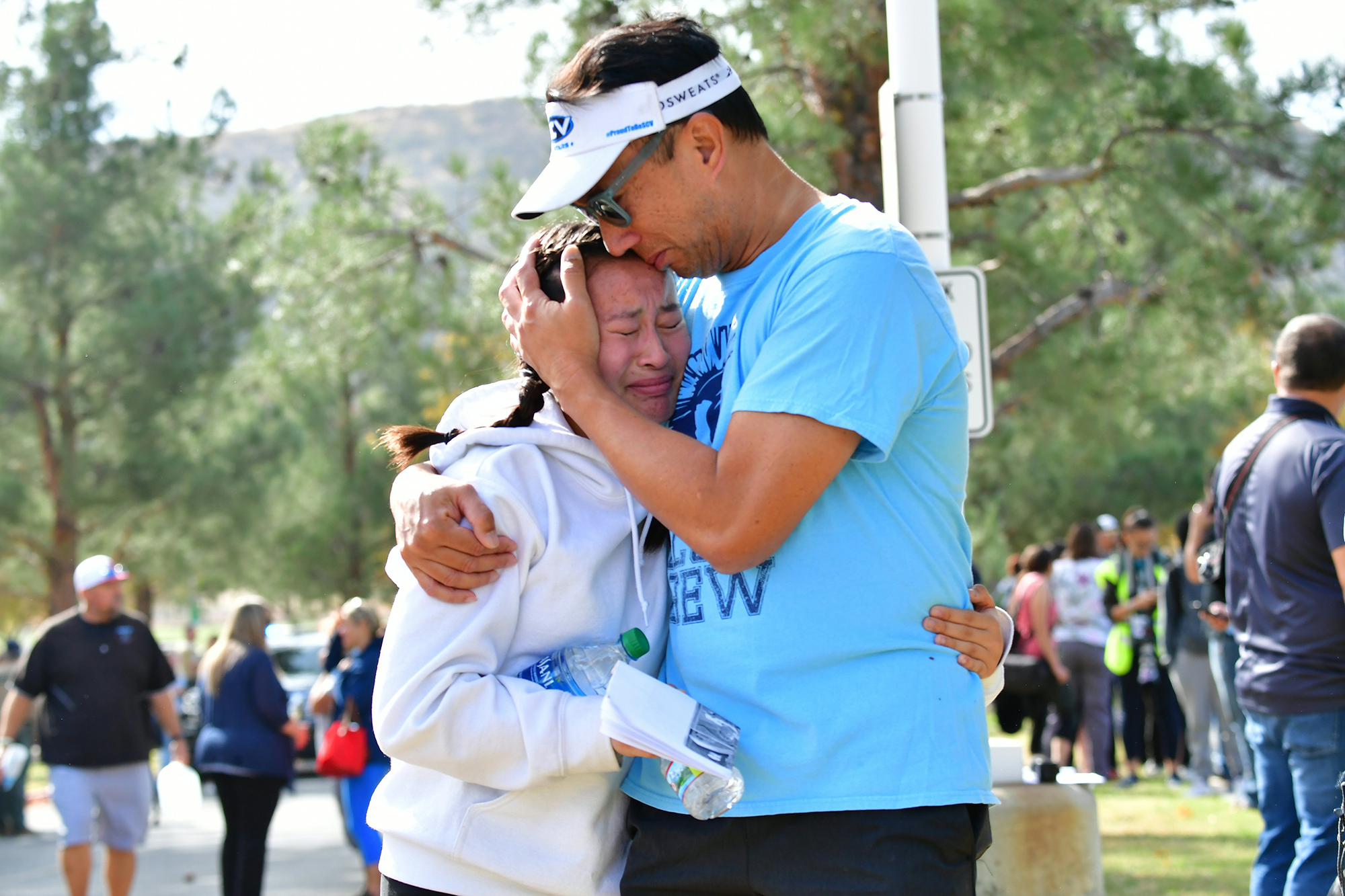 A man embraced his daughter after a shooting at Saugus High School on Thursday.
