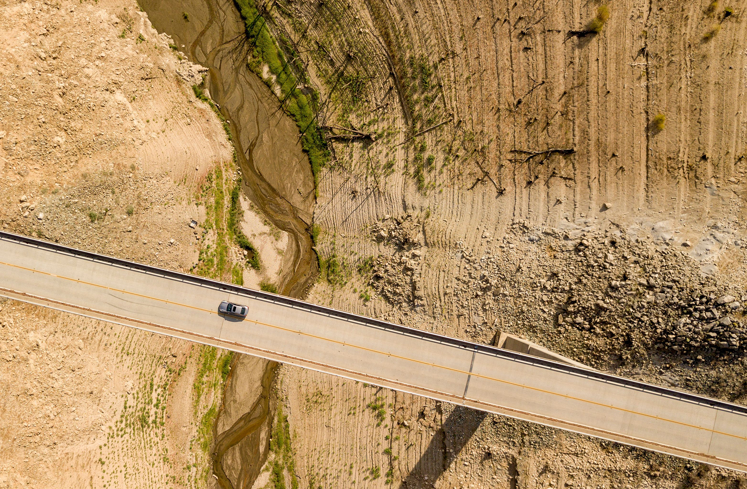 A car drove along a bridge over parched Lake Oroville on Sept. 5, 2021.