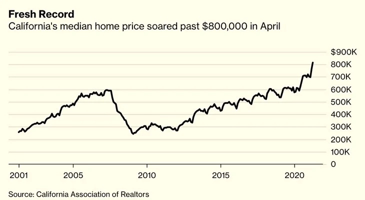 ☝️ Bloomberg shared this eye-popping visualization of California’s surging median home price.