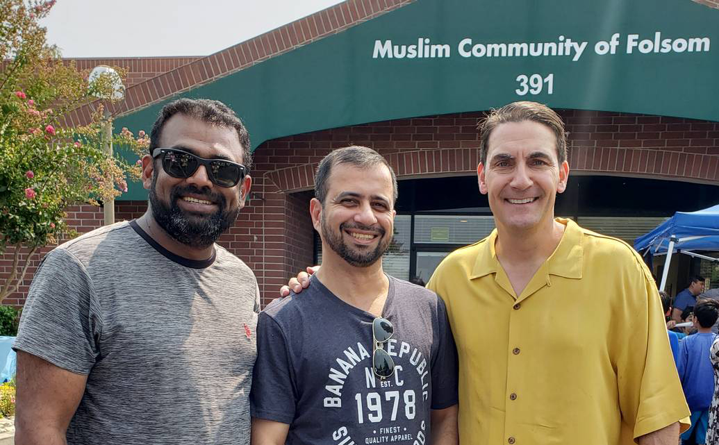 Republican House candidate Andrew Grant, right, with Mohammed Khader, left, and Fiaz Saied outside the Muslim Community of Folsom building on Sunday.