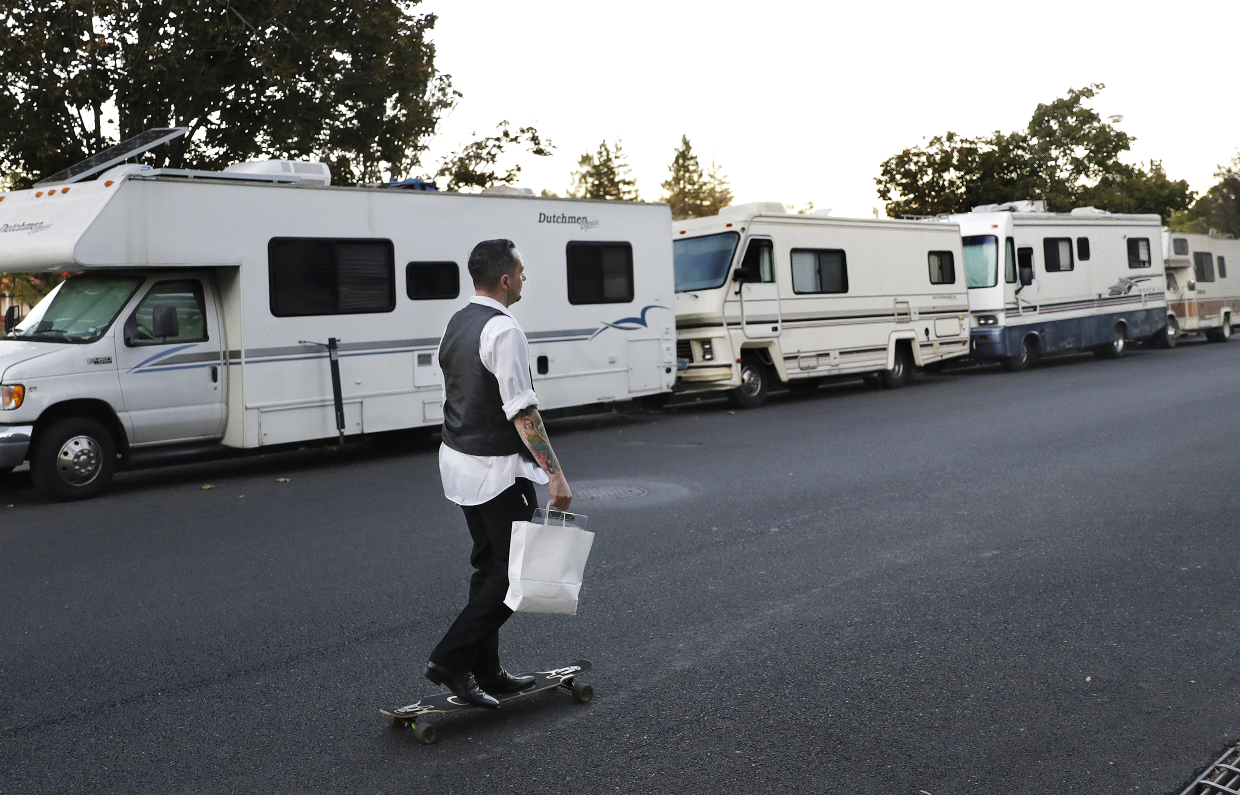 A row of RVs in Mountain View, where people live and sleep in the heart in the Silicon Valley.