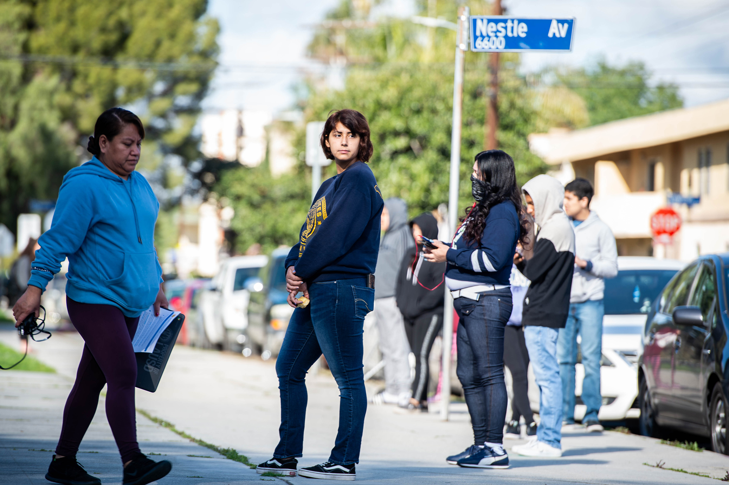 Students waited to collect Chromebooks in Reseda last week.