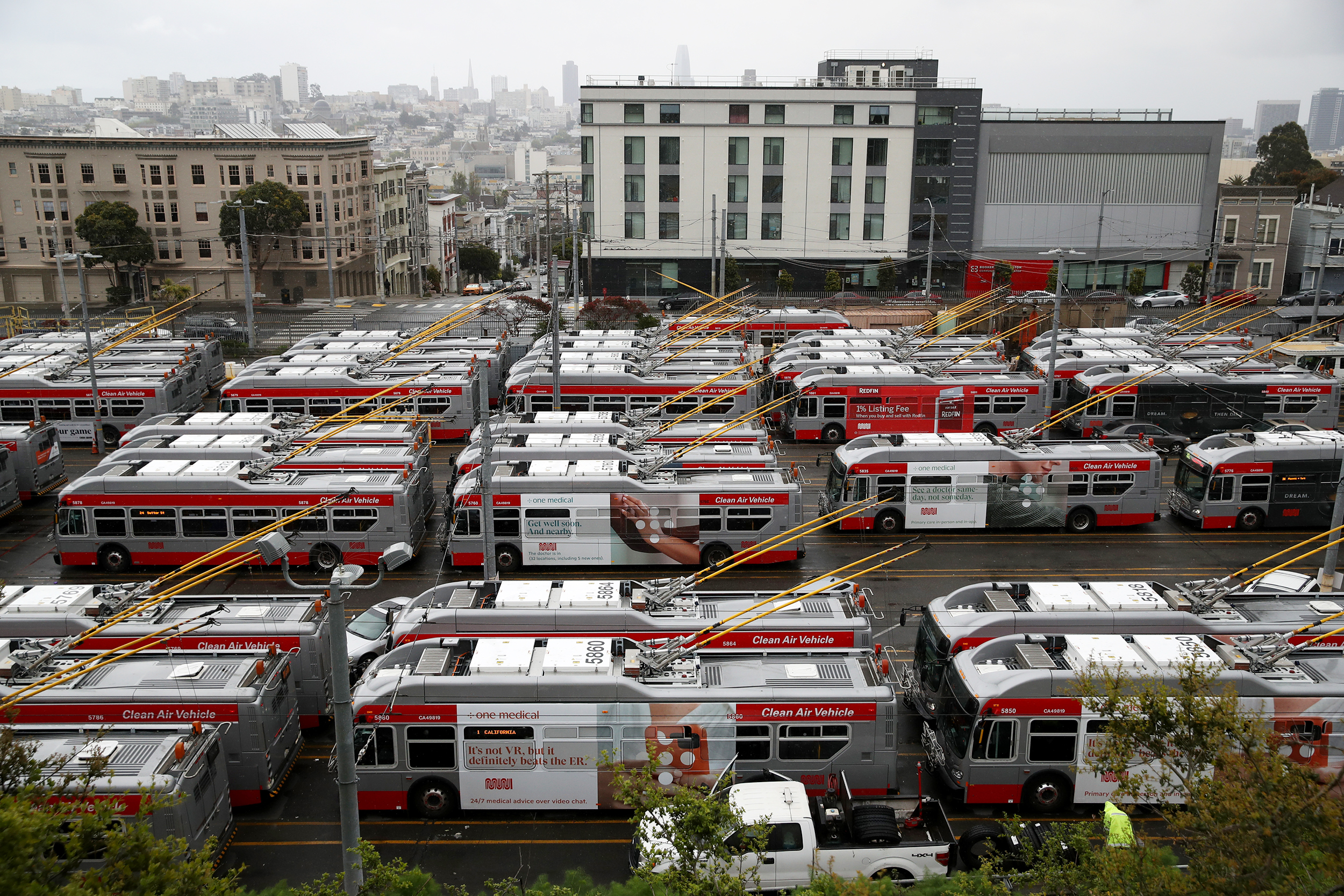 Parked Muni buses in San Francisco on Monday. Most bus lines have been halted.