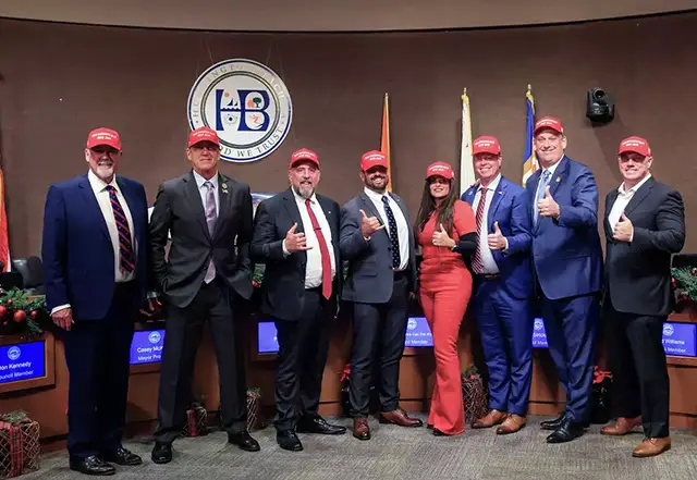 While the state’s Democrats position themselves to spearhead the country’s anti-Trump resistance, Huntington Beach’s leaders have formed what could be a bastion of MAGA resistance inside California. Last week, three new Republican members joined the City Council, meaning all seven seats are now held by members of the party. They marked the occasion by posing for a photograph in MAGA-style “Make Huntington Beach Great Again” hats, above. Councilmember Tony Strickland dubbed it the “MAGA-nificent 7.” SFGATE