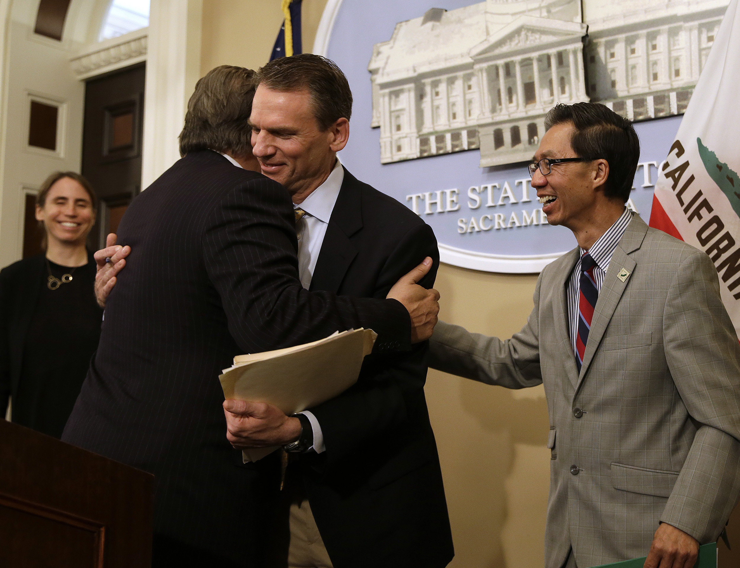 State Sen. Bob Hertzberg, left, and Assemblyman Ed Chau, right, celebrated with Alastair Mactaggart, center, after the approval of a data privacy bill in Sacramento on June 28.