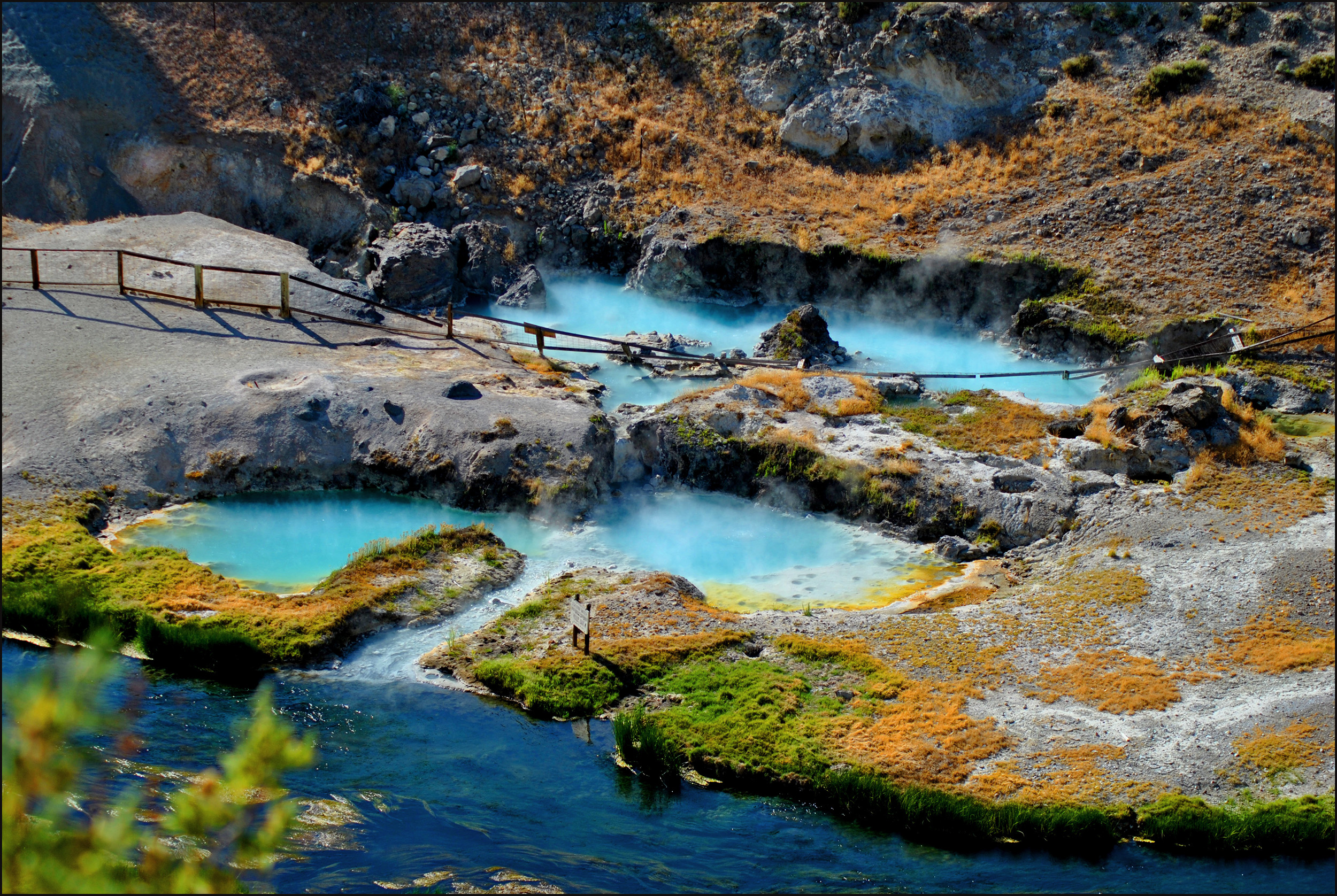 The blue pools at Hot Creek Geologic Site are part of the Long Valley Caldera.