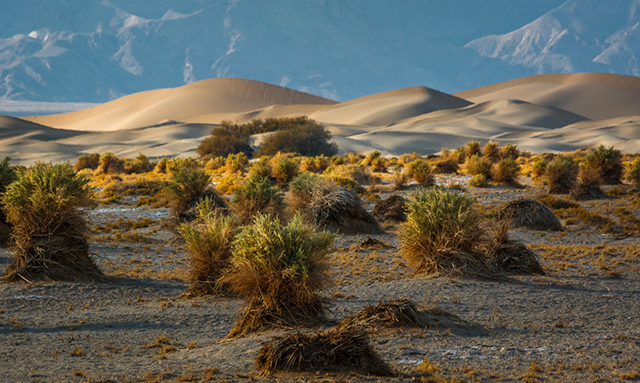 When pioneers seeking a shortcut to California’s gold fields became trapped in a harsh desert, they called it Death Valley. The Timbisha Shoshone people, who had thrived there for thousands of years, were irritated by the name. Where the white people saw danger and desolation, the Timbisha drifted with the seasons and knew where to find water, edible plants, and bighorn sheep. They used a willowlike shrub known as arrowweed to make granaries and arrow shafts. Early park promoters thought it looked like bundled corn left to dry at harvest time. They gave a picturesque field of arrowweed another name that likely bothered the Timbisha: the Devil’s Cornfield, pictured above.