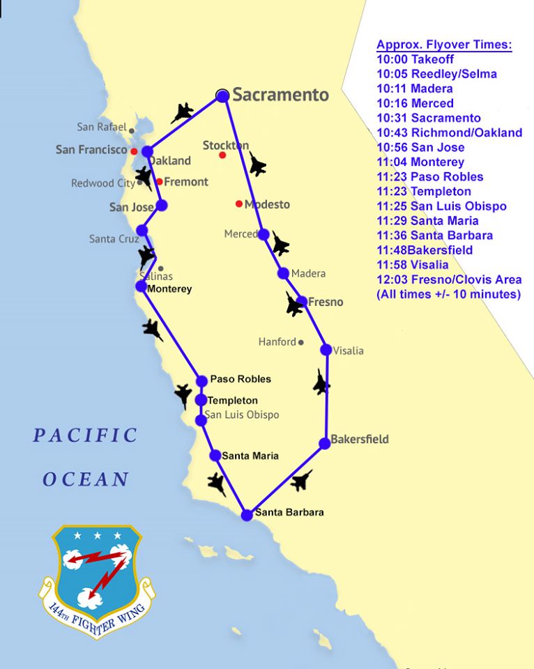 The flight path begins and ends in Fresno between 10 a.m. and noon.