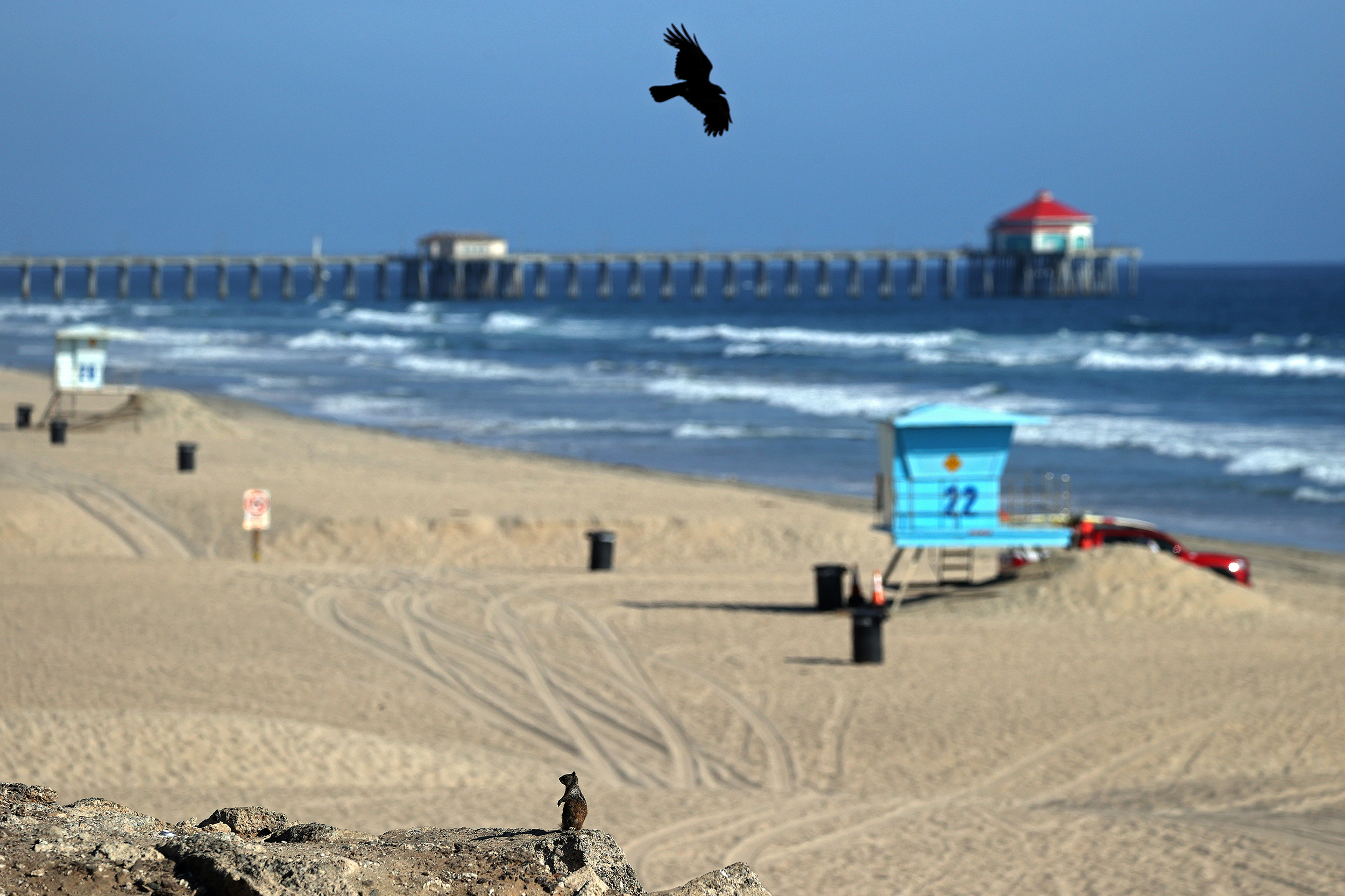 A squirrel enjoyed the quiet at an empty beach in front of the Huntington Beach Pier on Sunday.