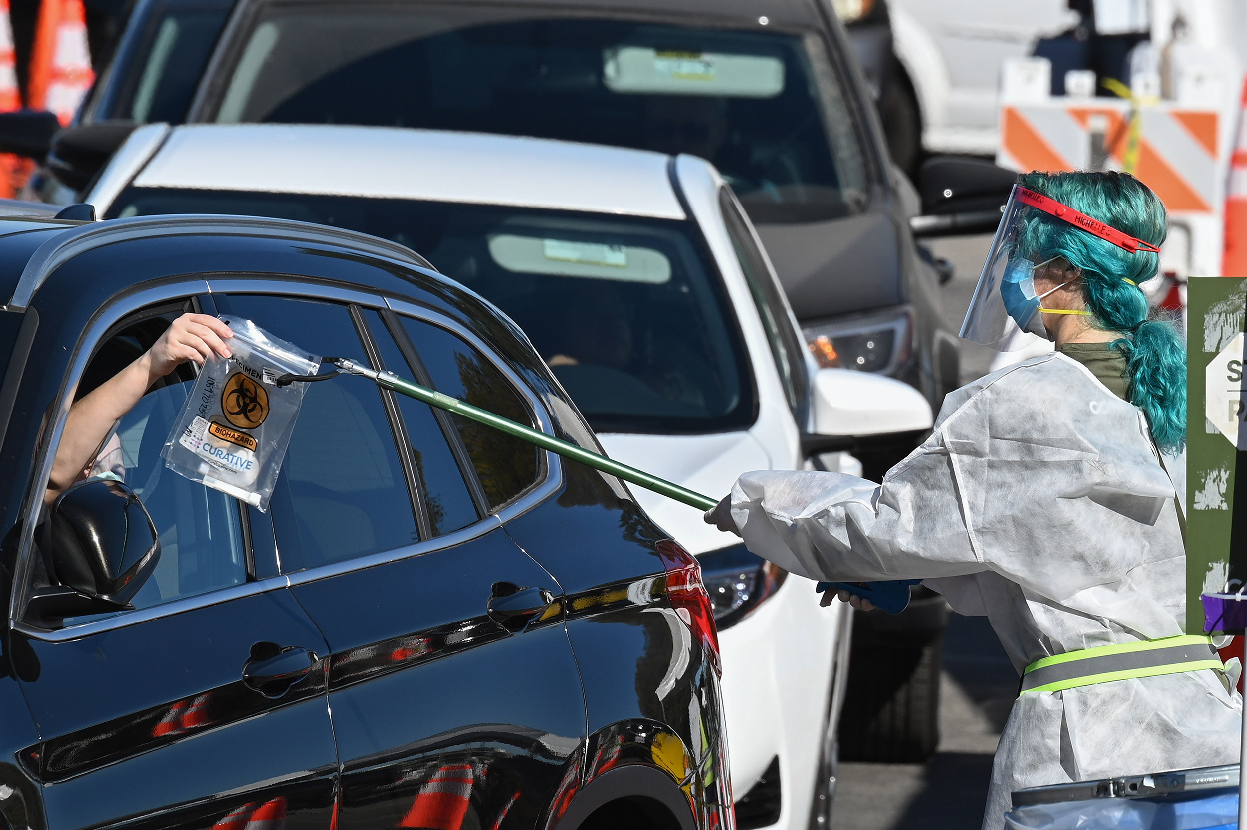 A healthcare worker collected a coronavirus test in Los Angeles on Monday.