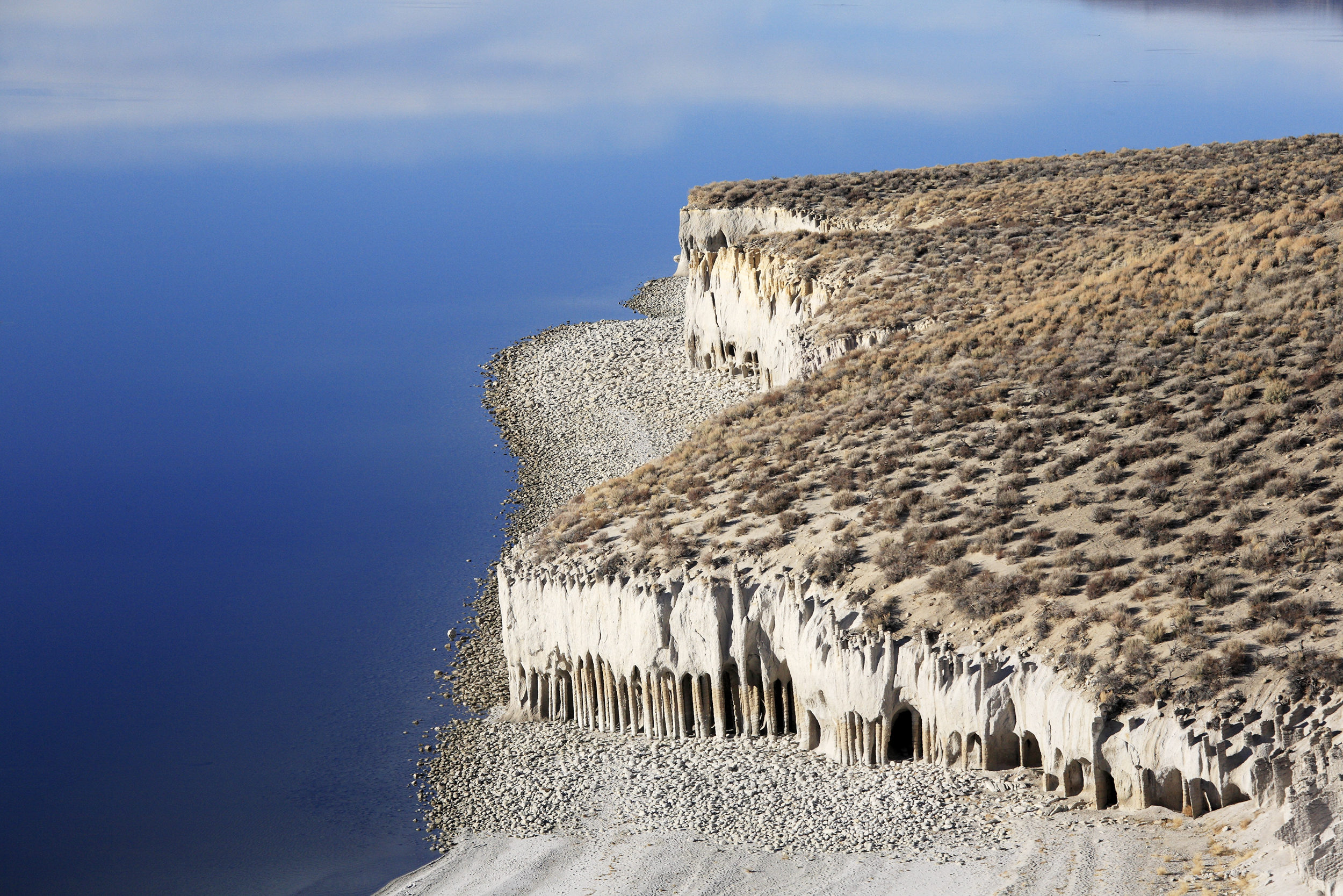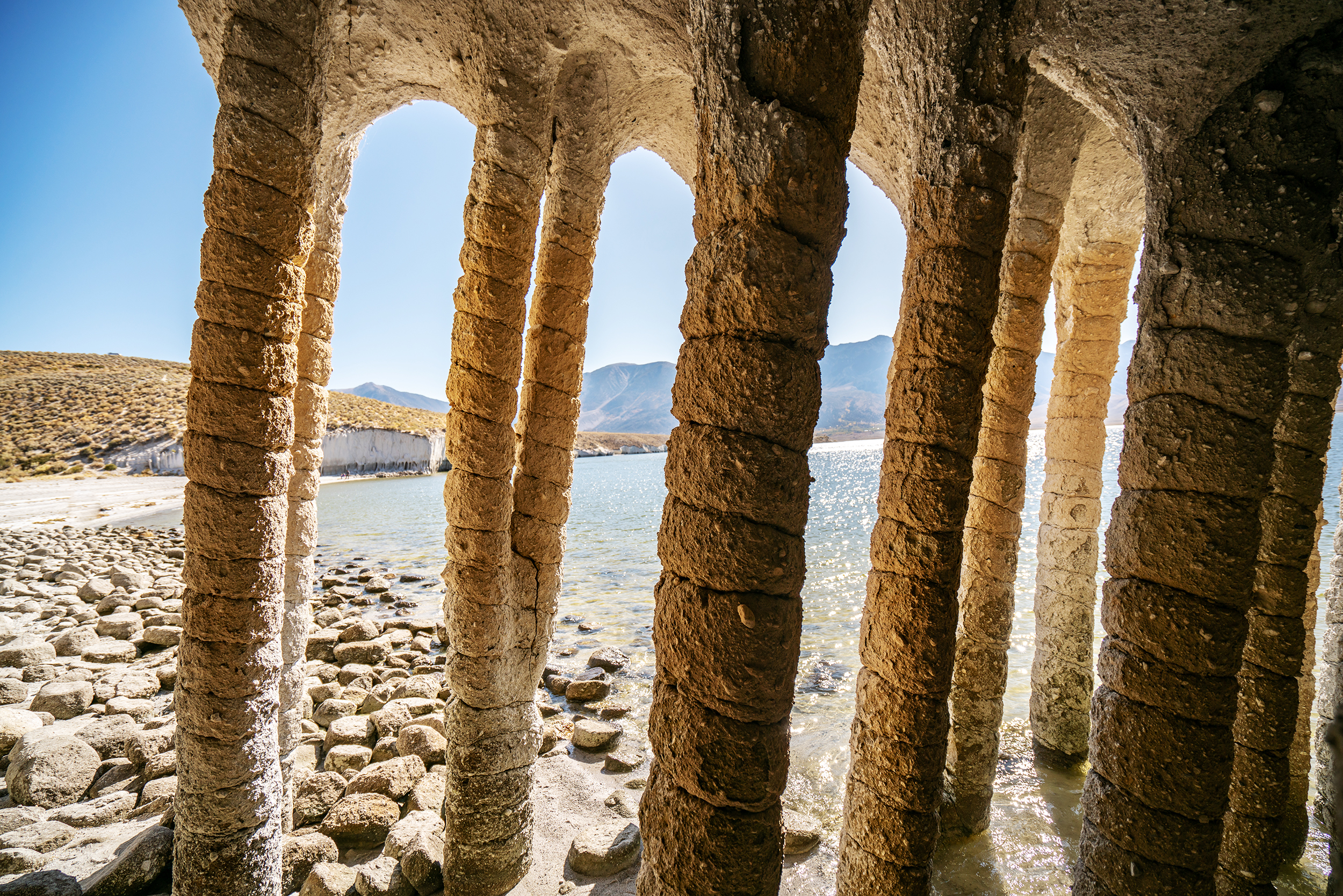 The Crowley Lake columns rise as high as 20 feet from the fringes of an artificial reservoir in the Eastern Sierra. But their perfectly cylindrical shape, evenly spaced grooves, and high arches were crafted not by hand but geological forces dating back 760,000 years. Scientists believe the pillars formed as water seeped through a vast layer of volcanic ash, creating something akin to natural pipes that hid underground for eons until being exposed by the lapping waves of the reservoir, completed in 1941.