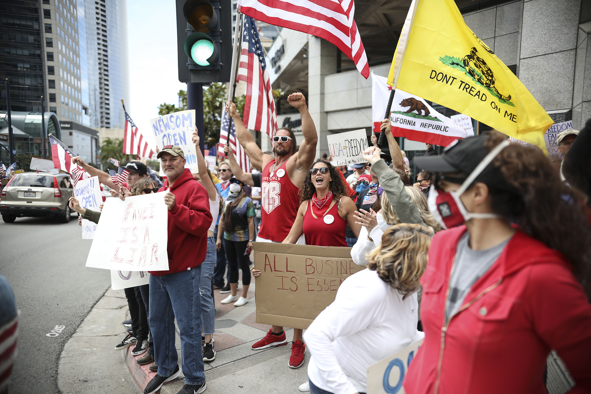 Protesters spilled onto the streets of San Diego, Encinitas, San Clemente, and other places between Friday and Sunday to demand the reopening of the state. Maga gear and American flags abounded amid the tightly packed crowds in which most people went without masks. Signs included “Give me liberty or give me death,” “Defy fascist lockdown,” and “Covid-19 is a lie.” NBC San Diego | O.C. Register | L.A. Times