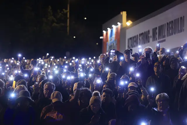 On the first anniversary of the Los Angeles wildfires, survivors alternated between expressions of rage and mourning at gatherings across the city. At the American Legion veterans post in the Palisades, hundreds paid tribute to lost loved ones in a military-style ceremony. Down the street, a larger crowd shouted, “They let us burn.” In a gathering of thousands in Altadena, residents hugged and cried. They sang “Stand by Me” and held up their cellphone lights in a moment of silence for 19 neighbors who died. “Altadena forever!” a woman cried, eliciting cheers. L.A. Times