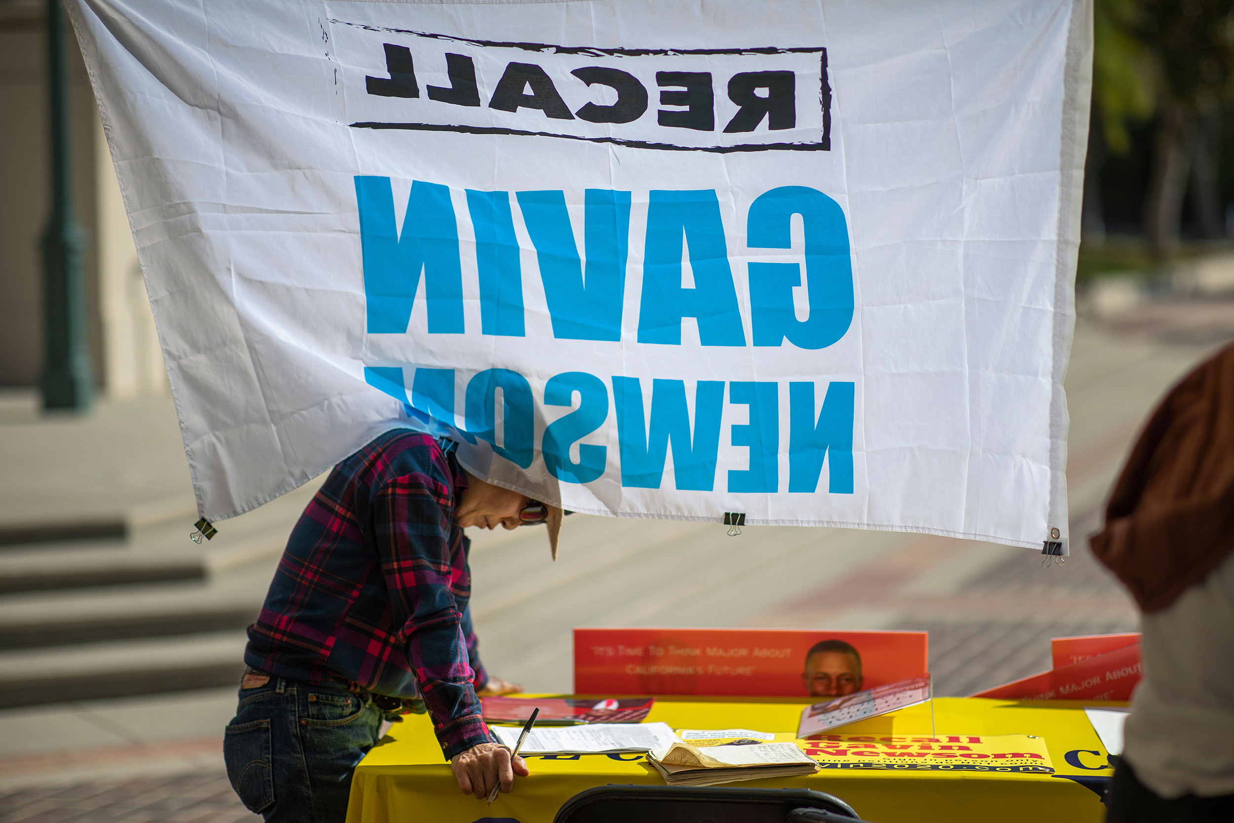 A recall supporter manned a booth in Pasadena on Feb. 28.