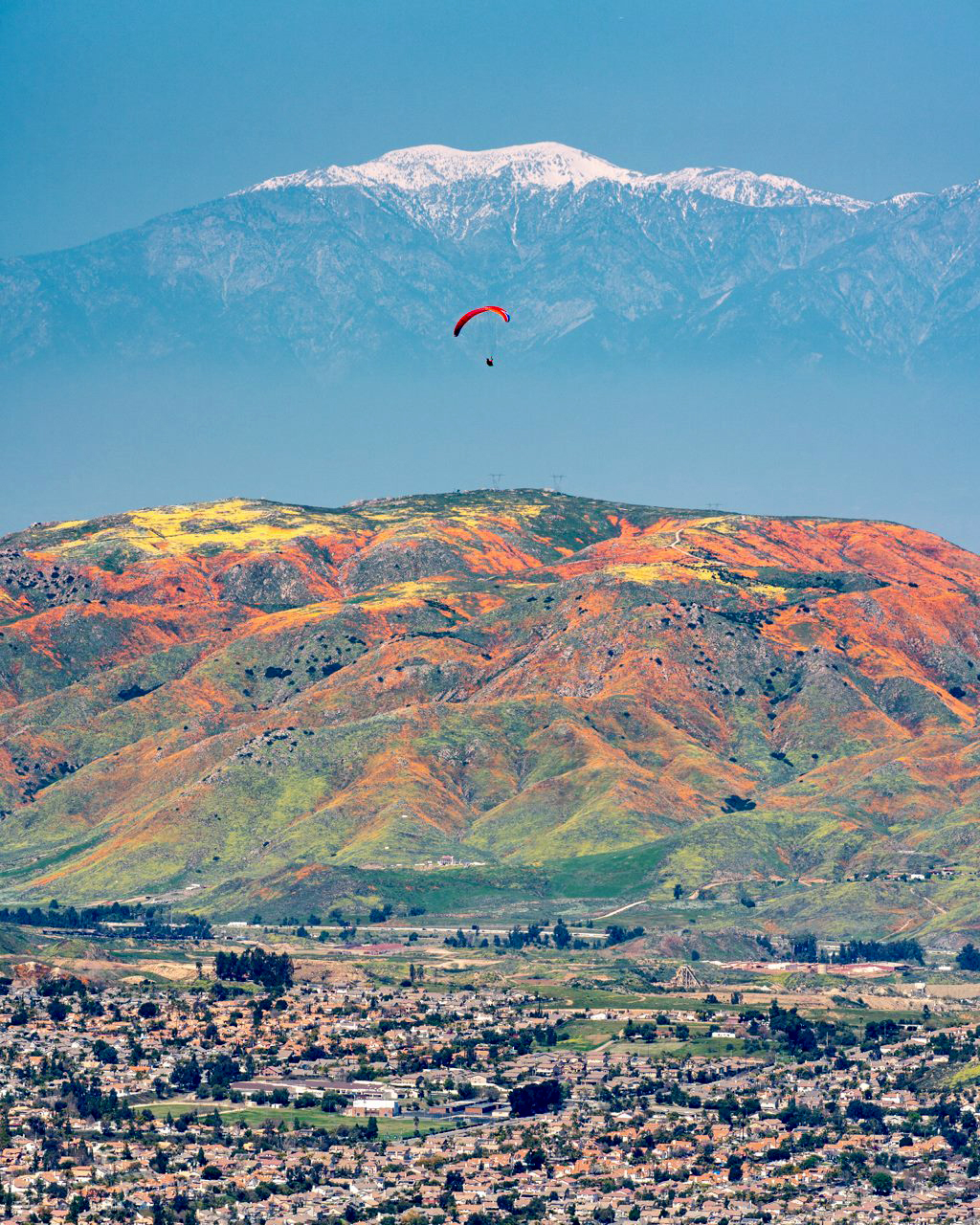 Here’s one way to enjoy the superbloom. Last weekend, California photographer Kurt Lawson caught this breathtaking view of a paraglider swooping above the flower-covered hills around Lake Elsinore. “What a great joy it must have been to be flying on this day!” he wrote.