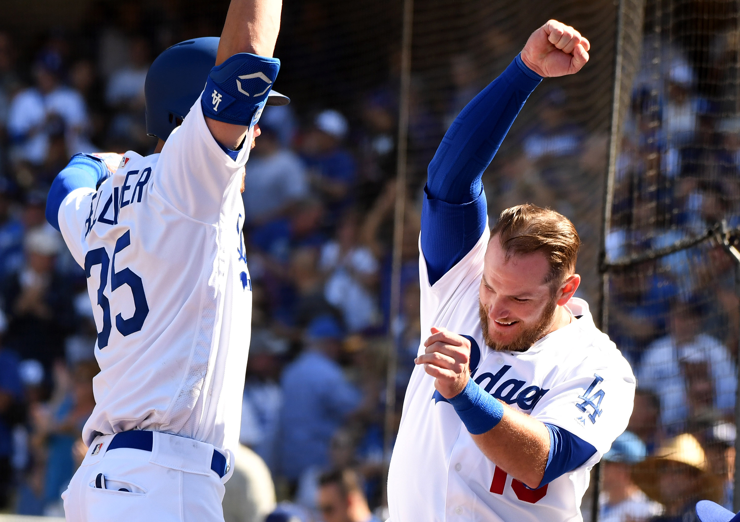 Cody Bellinger, left, celebrated with Max Muncy after hitting a home run at Dodger Stadium on Thursday.