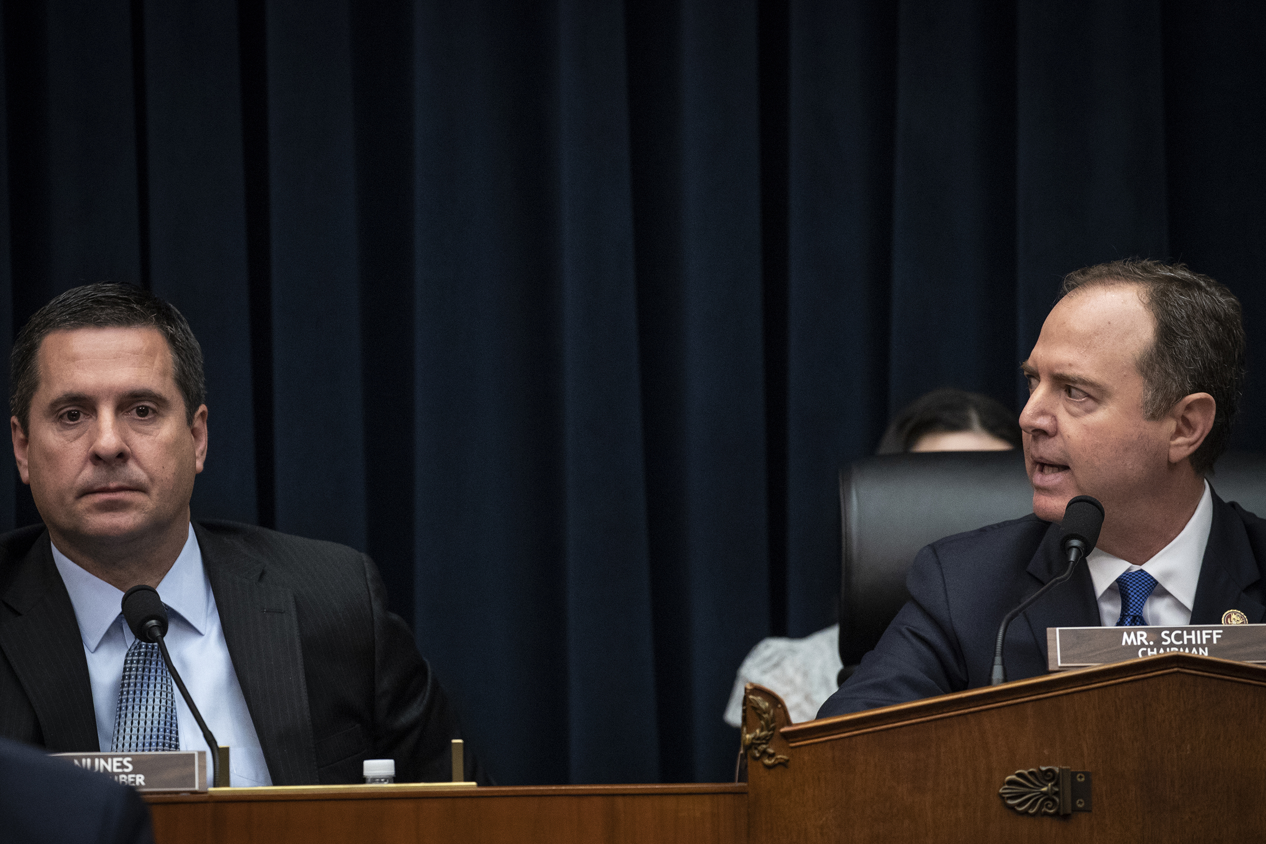Rep. Devin Nunes looked on as Rep. Adam Schiff responded to Republican calls for him to resign as chairman of the House Intelligence Committee on Thursday.