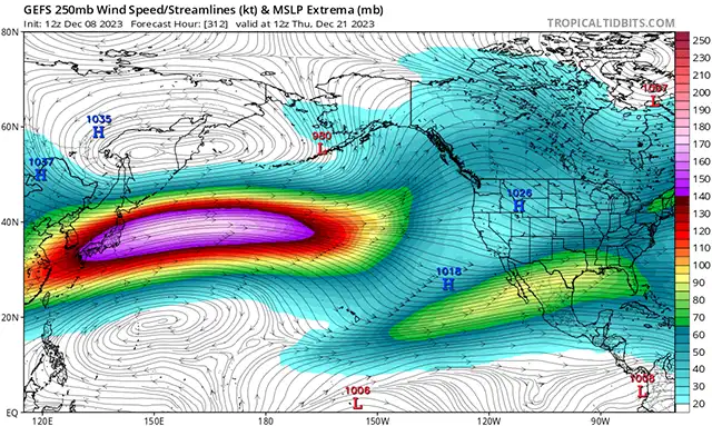 Meteorologists have been growing increasingly enthusiastic about models depicting a Pacific jet stream arcing thousands of miles from Japan toward California over the next two weeks. The climatologist Daniel Swain reminded readers of his blog that he can’t guarantee the forecast. “But right now, there are some pretty striking things appearing” in long-range models. “Will it make it all the way, and will it still be remarkably strong?” he wrote. “Will it direct a sequence of strong/moist storms into California in the days following? I’m leaning toward yes at the moment, but as always … things can change.” Weather West