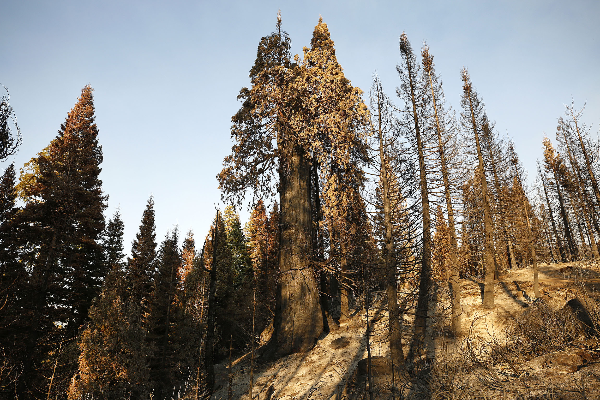 The charred landscape of Alder Creek Grove after the 2020 Castle fire.