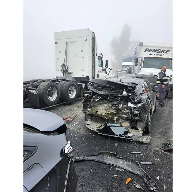Dense fog led to another pileup in the Central Valley. Days after 43 vehicles crashed along a highway in Bakersfield, a 59-vehicle pileup left 10 people injured on Highway 99 in Tulare County early Saturday. As visibility dropped to between 100 and 200 feet, crashes happened on both sides of the highway, piling up one-by-one as vehicles slammed into the stoppages. “The carnage out there,” said CHP officer Adrian Gonzalez. “Vehicles turned over and up on each other, under each other.” KFSN | Visalia Times-Delta