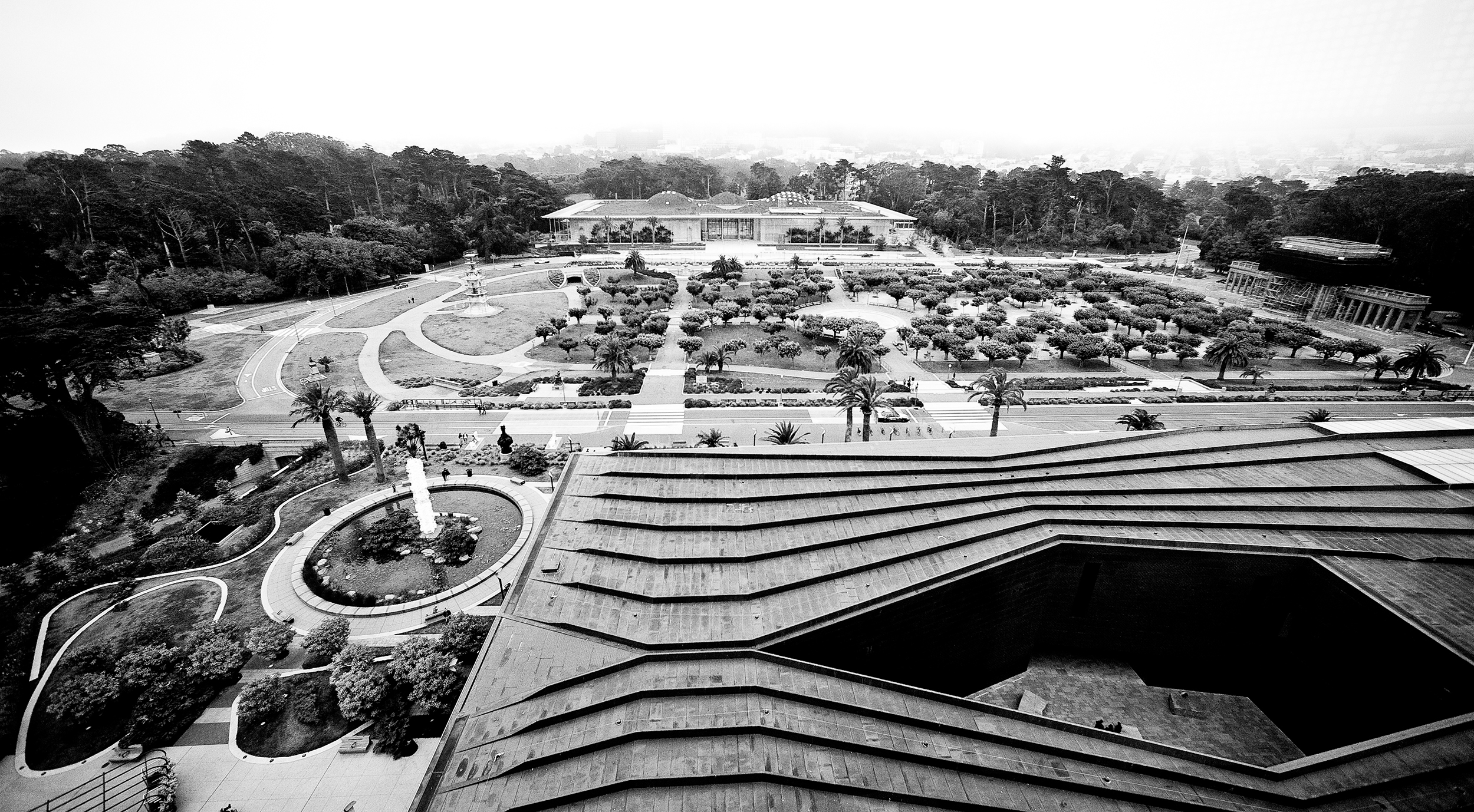 The roof of the de Young Museum, foreground, in San Francisco’s Golden Gate Park.